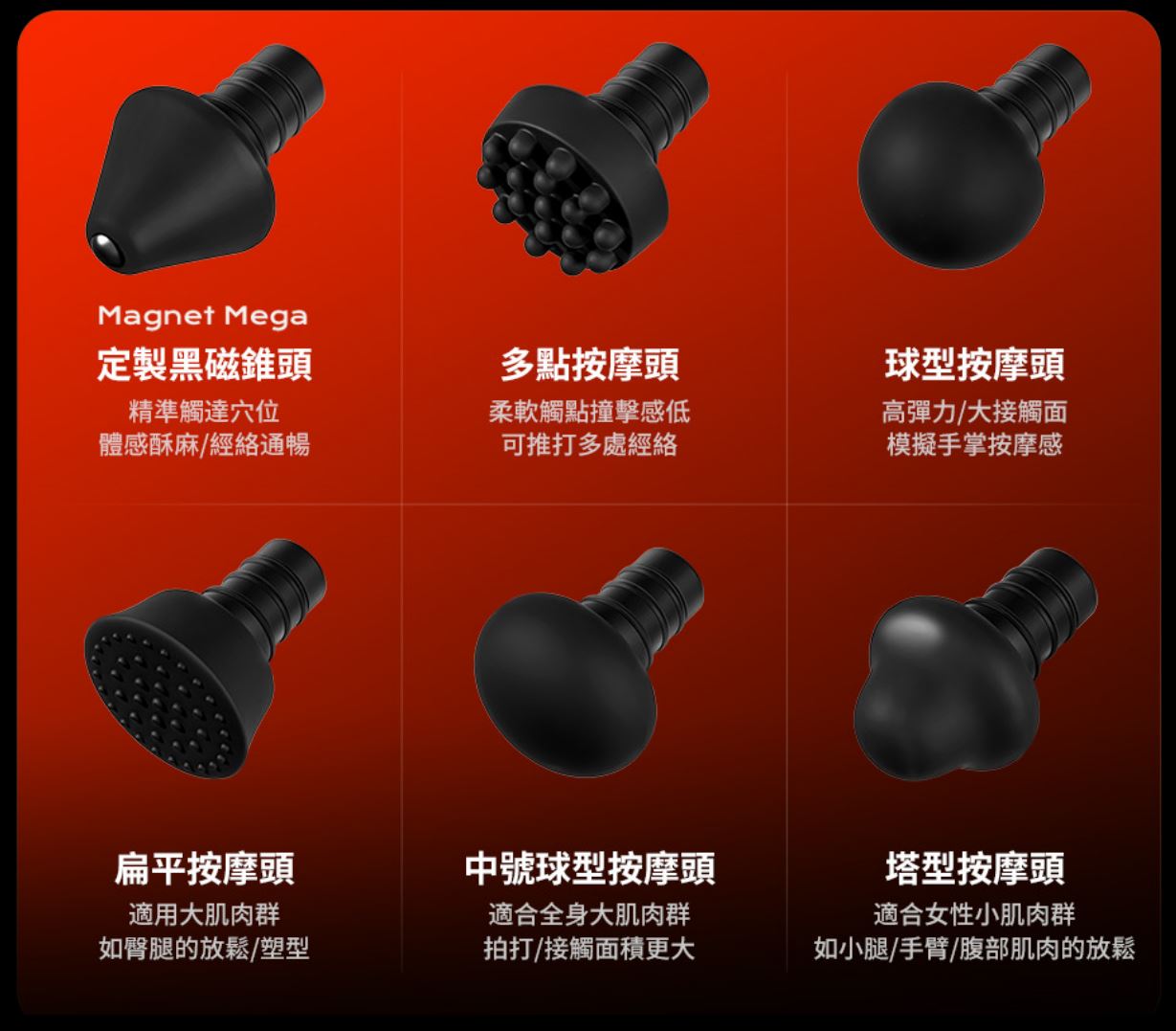 6款按摩頭(特別是由黑磁石製成的黑磁錐頭,《本草綱目》中有記載:慈(通磁)石治腎家諸病,而通耳明目。除此之外也對小範圍穴位效果很好,在痠痛點停留 5–10 秒,彷彿整復師傅在點壓!)